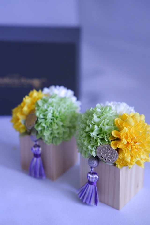 【送料無料・2個セット】コンパクト仏花|アーティフィシャルフラワー|お手入れ不要で長持ち|モダン仏壇・納骨堂対応 忙しい現代に寄り添う、美しく実用的な仏花 水替え不要、枯れる心配なし。いつまでも美しく故人を偲ぶことができる、上品なアーティフィシャルフラワーの仏花です。 ふんわりと丸みのある高品質マム(菊)をメインに、温かみのある天然ヒノキ製の器に丁寧にアレンジしました。職人が一つひとつ手作りで仕上げた、心のこもった仏花です。 選ばれる5つの理由 • ✅ お手入れ完全不要 - 水替えや花の入れ替えが不要で、忙しい毎日でも安心 • ✅ コンパクト設計 - 現代のモダン仏壇・納骨堂にぴったりのサイズ感 • ✅ 高級感あふれる仕上がり - 本物の花と見間違うほどの美しいクオリティ • ✅ 上品なタッセル付き - 深い紫色のタッセルが全体の品格を高める特別な装飾 • ✅ 長期間美しさをキープ - 色あせしにくい高品質素材を使用 美しい2色展開(2個セット) • 紫×淡いピンク - 上品で落ち着いた色合い、どんな仏壇にも調和 • 黄色×グリーン - 明るく温かみのある色合い、故人への愛情を表現 どちらの組み合わせも、故人を偲ぶ心を美しく表現します。 詳細仕様 ・ヒノキ製土台:4cm角(国産天然木使用) ・全体サイズ:幅約6cm × 高さ約9cm ・重量:軽量で取り扱いが簡単 ・付属品:高級感ある紫タッセル、装飾用天然素材パーツ ・セット内容:2個セット(左右対) こんな方におすすめ ★ ご自宅用として ・モダン仏壇・コンパクト仏壇をお持ちの方 ・頻繁な花の交換が困難な方 ・清潔で美しい仏壇環境を保ちたい方 ★贈り物として ・お悔やみの気持ちを込めた心のこもったギフト ・新盆・お彼岸・命日のお供え ・ペット供養・ペット仏壇用として ★ 品質へのこだわり • 職人の手仕事:一つひとつ丁寧に手作業でアレンジ • 厳選素材:色あせしにくい高品質アーティフィシャルフラワーを使用 • 安心品質:日本国内で品質管理された安心・安全な商品 ※ご購入前にご確認ください ・2個セットでの販売となります ・天然木を使用しているため、木目や色合いに個体差があります ・ご利用環境により、色味が実物と異なる場合があります ・直射日光を避けて保管してください